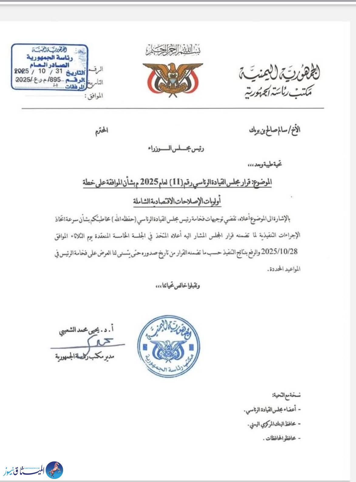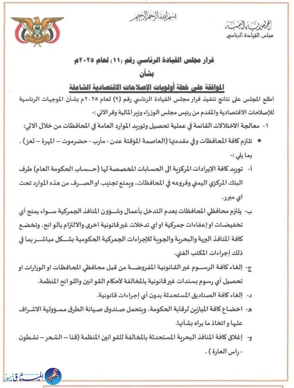 ويأتي القرار بعد اطلاع المجلس على نتائج تنفيذ قراره السابق رقم (9) لعام 2025 بشأن الموجهات الرئاسية للإصلاحات الاقتصادية، المقدّم من رئيس مجلس الوزراء وزير المالية، ويُلزم القرار جميع الجهات المعنية بتنفيذ حزمة من الإجراءات المالية والإدارية الهادفة إلى معالجة الاختلالات في تحصيل الموارد العامة وتعزيز الإيرادات المستدامة.
