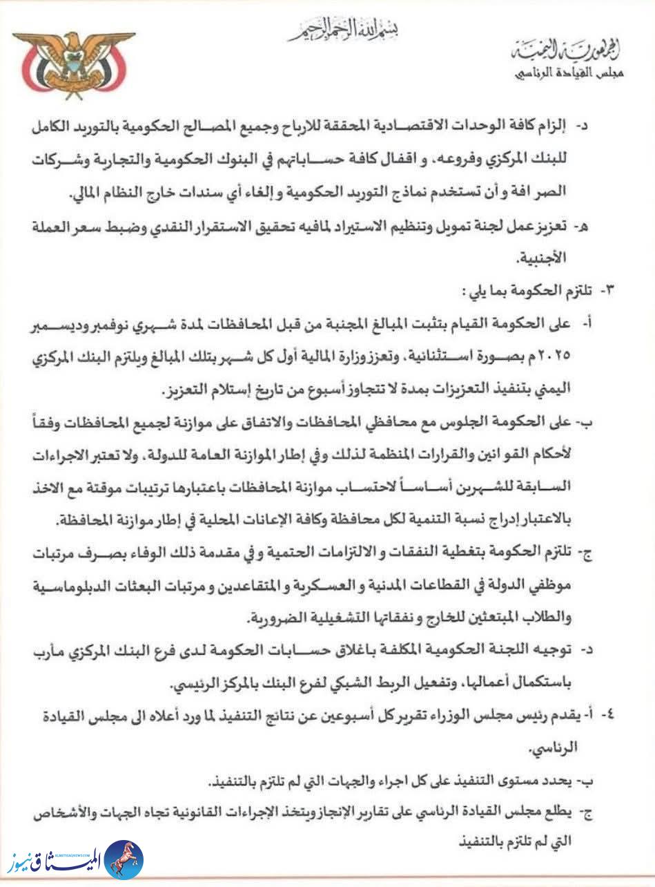 وأقر المجلس آلية رقابية صارمة، تقضي بتقديم رئيس مجلس الوزراء تقريراً كل أسبوعين عن نتائج التنفيذ، يتضمن مستوى الالتزام بكل إجراء والجهات المتقاعسة، على أن يتخذ مجلس القيادة الرئاسي الإجراءات القانونية اللازمة بحق المخالفين، مع منح رئيس الوزراء صلاحيات اتخاذ الإجراءات القانونية في إطار اختصاصه.