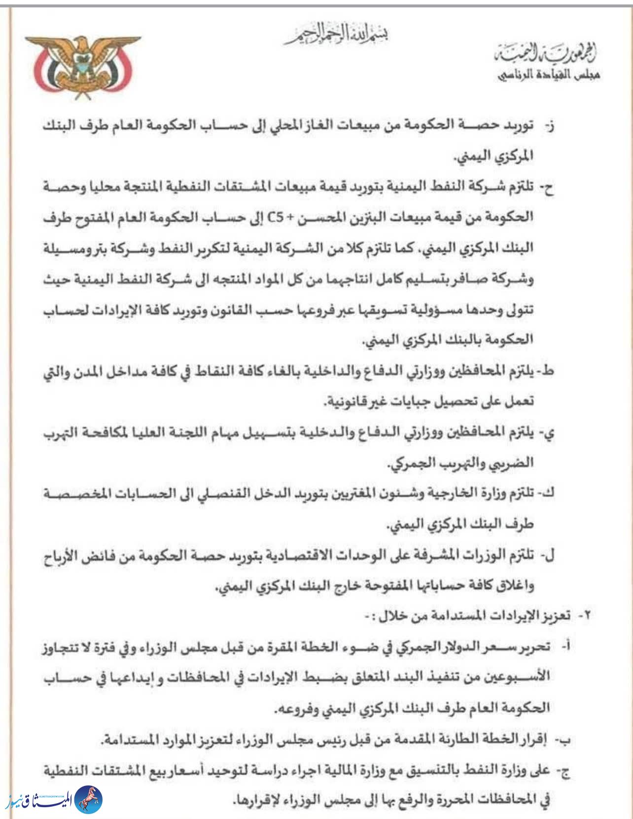 وينص القرار على إلغاء جميع النقاط الأمنية التي تحصل جبايات غير قانونية في مداخل المدن، ويلزم المحافظين ووزارتي الدفاع والداخلية بتسهيل مهام اللجنة العليا لمكافحة التهرب الضريبي والتهريب الجمركي. كما يُلزم وزارة الخارجية بتوريد الدخل القنصلي إلى الحسابات المخصصة في البنك المركزي، وجميع الوزارات المشرفة على الوحدات الاقتصادية بتوريد فائض الأرباح وإغلاق حساباتها خارج البنك المركزي.