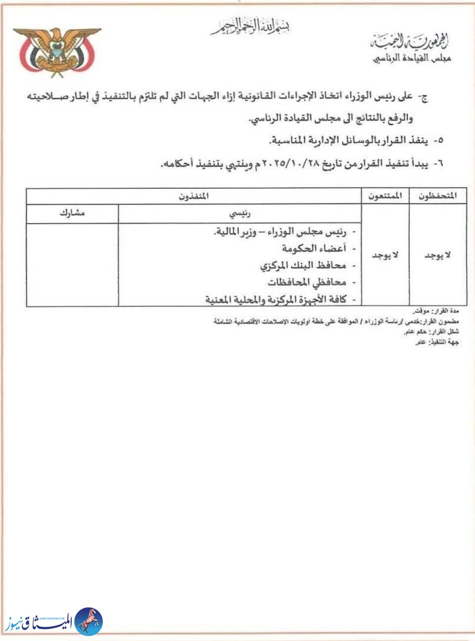 وينص القرار على بدء التنفيذ فور صدوره في 28 أكتوبر 2025، ويستمر حتى إنجاز جميع بنوده.