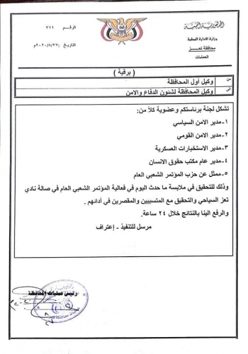 اتخاذ الاجراءات القانونية حيال المتسببين والمقصرين من الضباط والأفراد المكلفين بحماية القاعة وتأمين الاحتفال وذلك وفق نتائج التحقيق من قبل اللجنة المكلفة ....