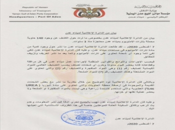 مؤسسة موانئ خليج عدن تنفي تخزين نترات الامونيوم في الميناء...