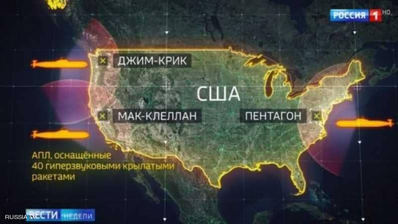 نشر التلفزيون الرسمي الروسي قائمة منشآت أميركية قد تستهدفها موسكو في حال اتخاذ قرار بشن ضربة نووية، مشيرا إلى صاروخ سرعته تفوق سرعة الصوت سيكون قادرا على ضرب الأهداف الأميركية في أقل من خمس دقائق.