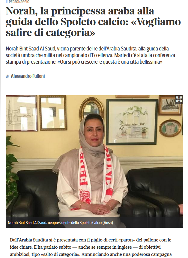 ونقلت الصحف الإيطالية عن الأميرة نورة قولها إن "كرة القدم تعد صاحبة النصيب الأكبر من المتابعة سعوديا وأن عائلتها شغوفة بهذه اللعبة كما أن مدينة سبوليتو صاحبة شهرة كبيرة على المستوى العالمي".